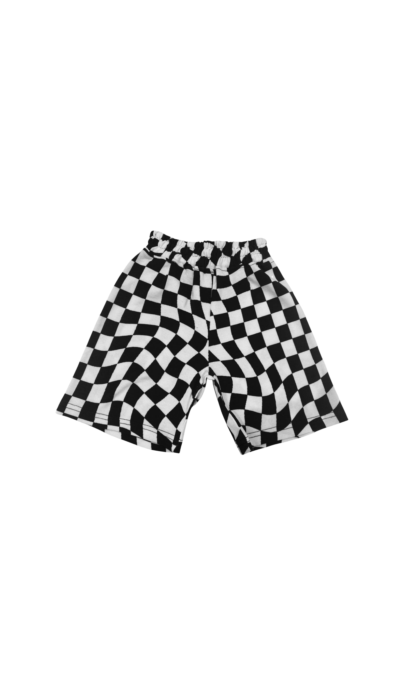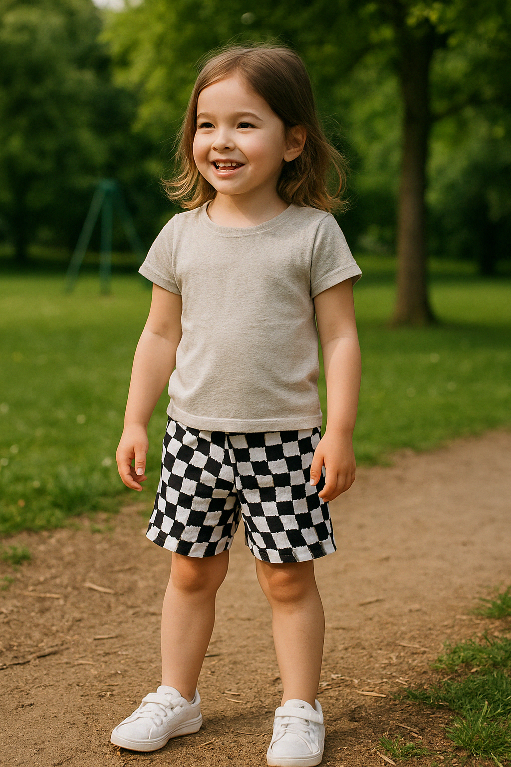 Siyah-beyaz dalga efektli dama deseniyle hem modern hem de eğlenceli bir stil sunan bu şort, miniklerin enerjisine ayak uydurur.