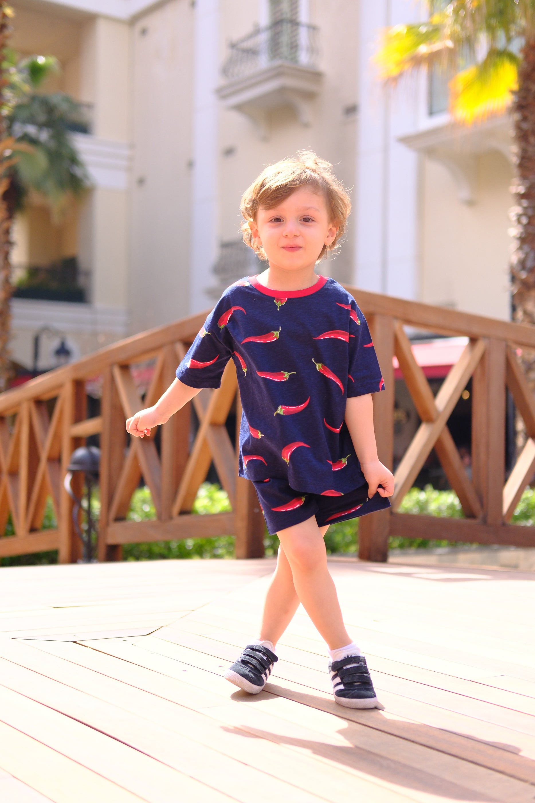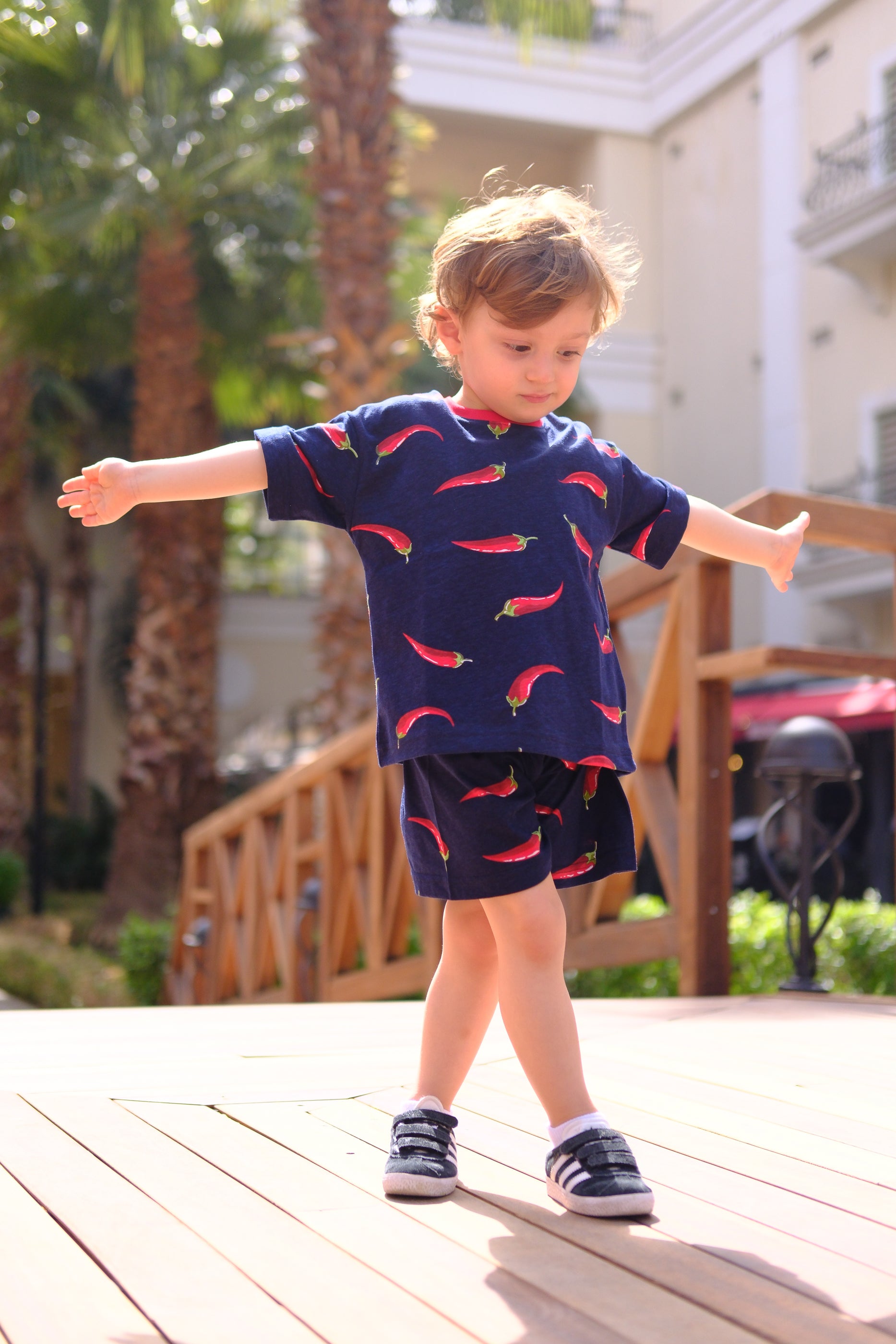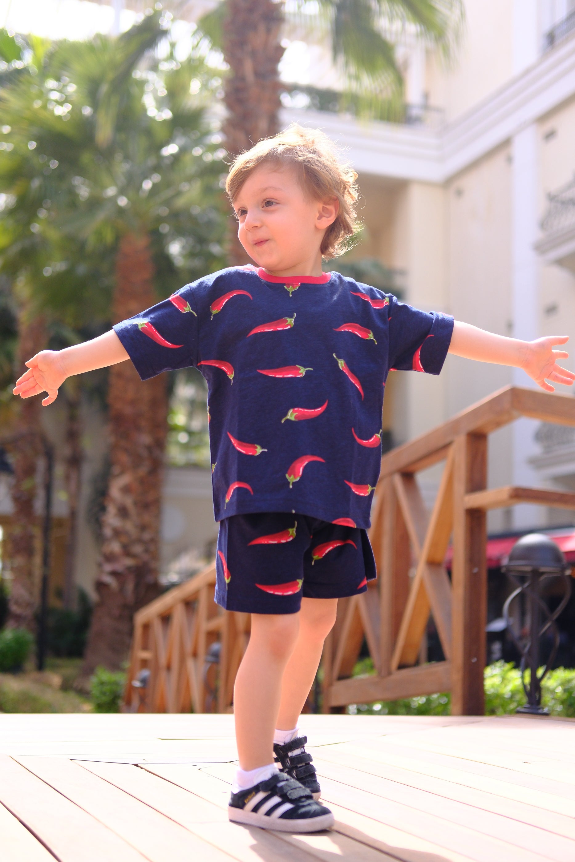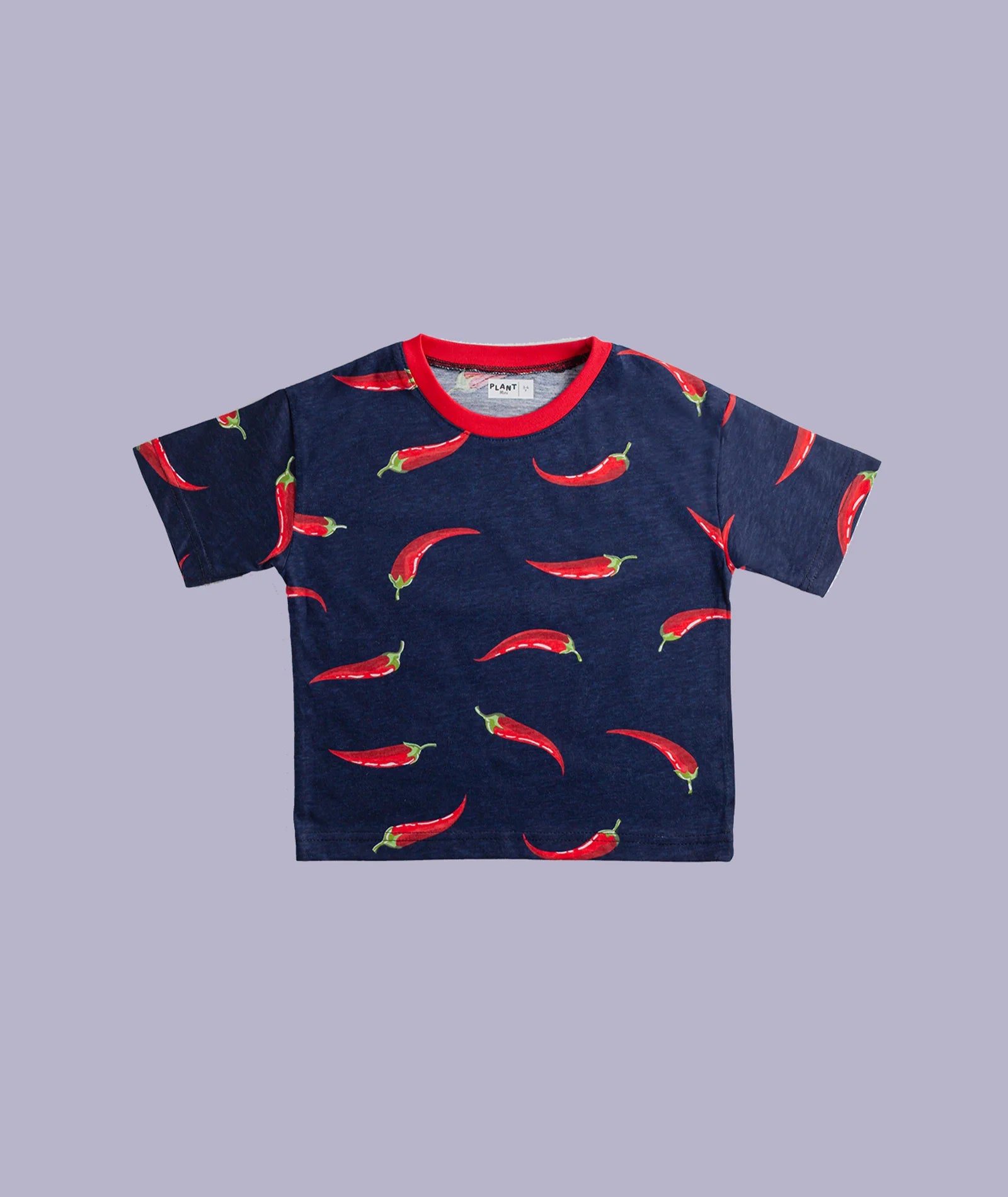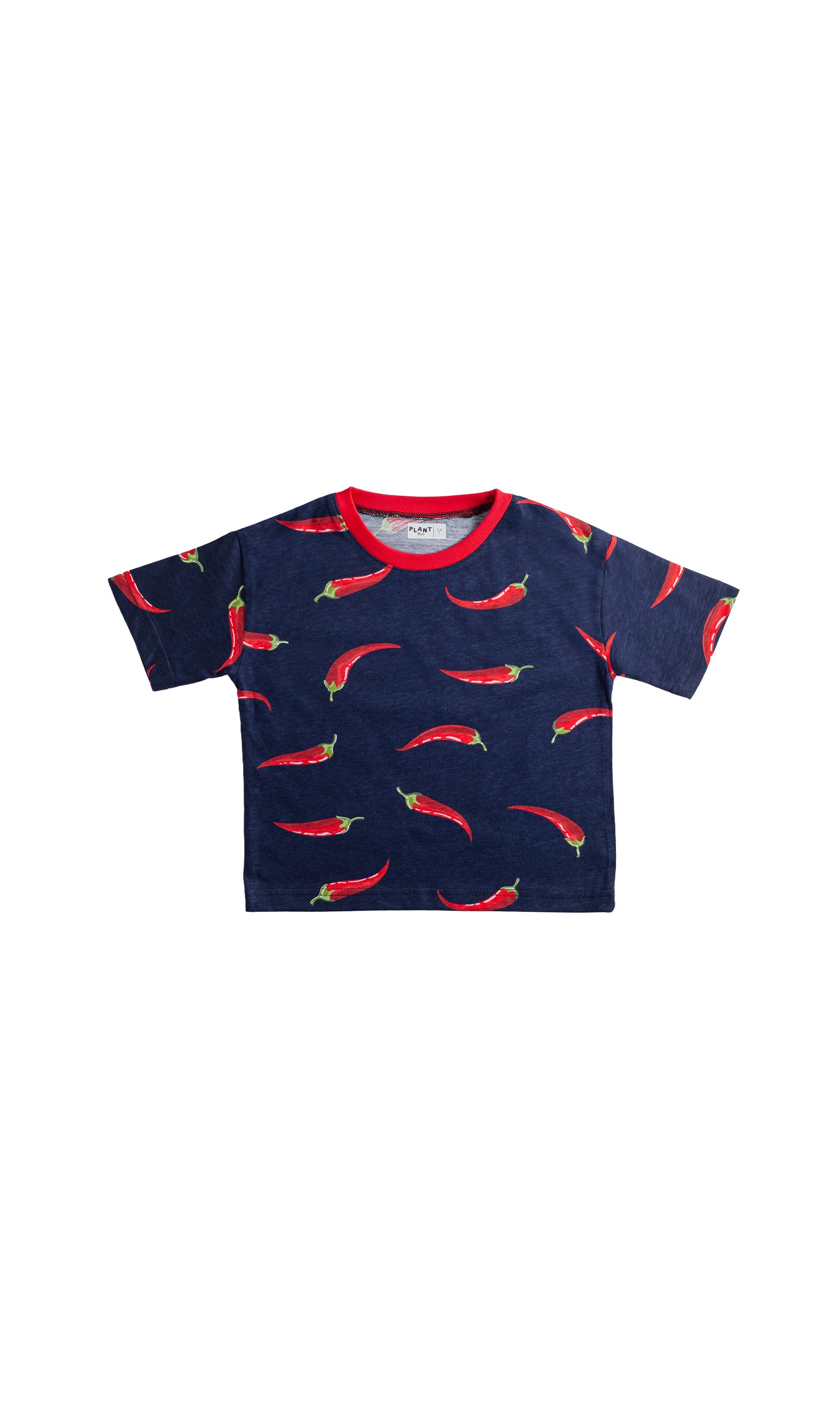 "Miniklerin bu yazı rahat ve tarz geçirmeleri için Pepper Baskılı Lacivert ve Kırmızı Biber Baskılı, Bisiklet Kırmızı Yaka, %100 Organik Pamuk T-Shirt Lacivert sizlerle!