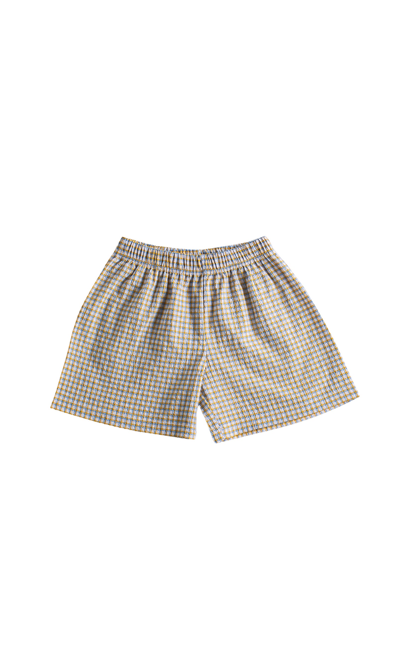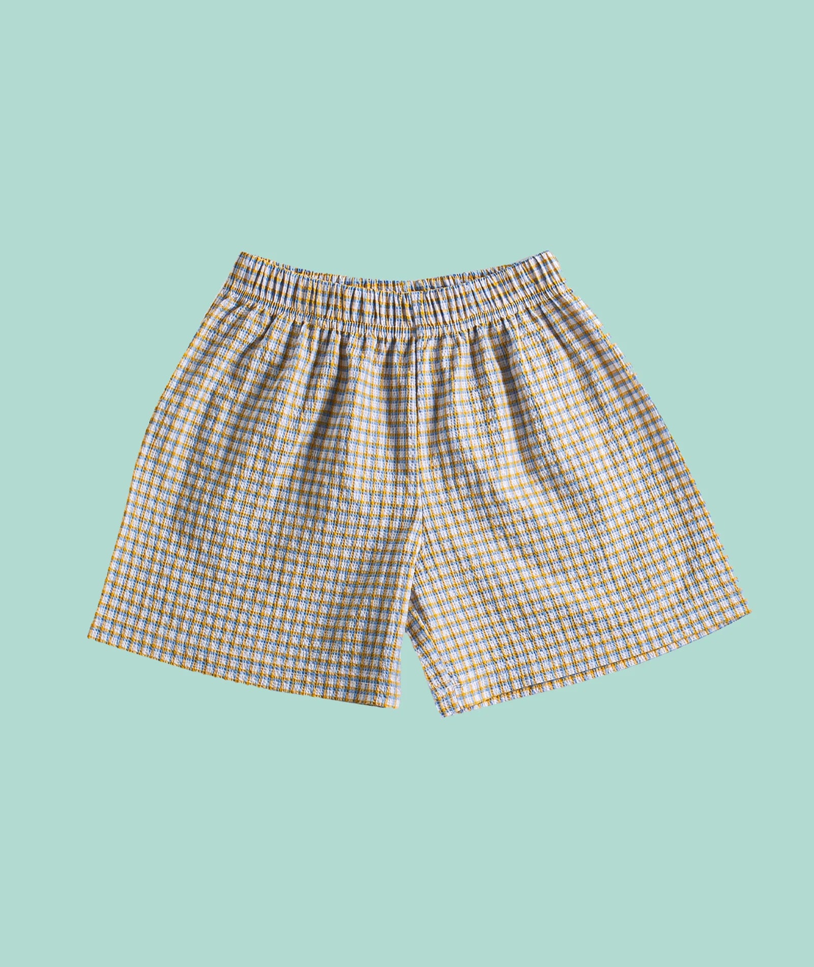 Kids' striped shorts in blue and yellow plaid, 100% cotton, elastic waistband, for the little ones to spend this summer in comfort and style! With our fun, comfortable, and breathable 100% cotton fabric collection that will suit your child very well this summer in Plant Mini Kids style, your kids will have a lot of fun and move freely!