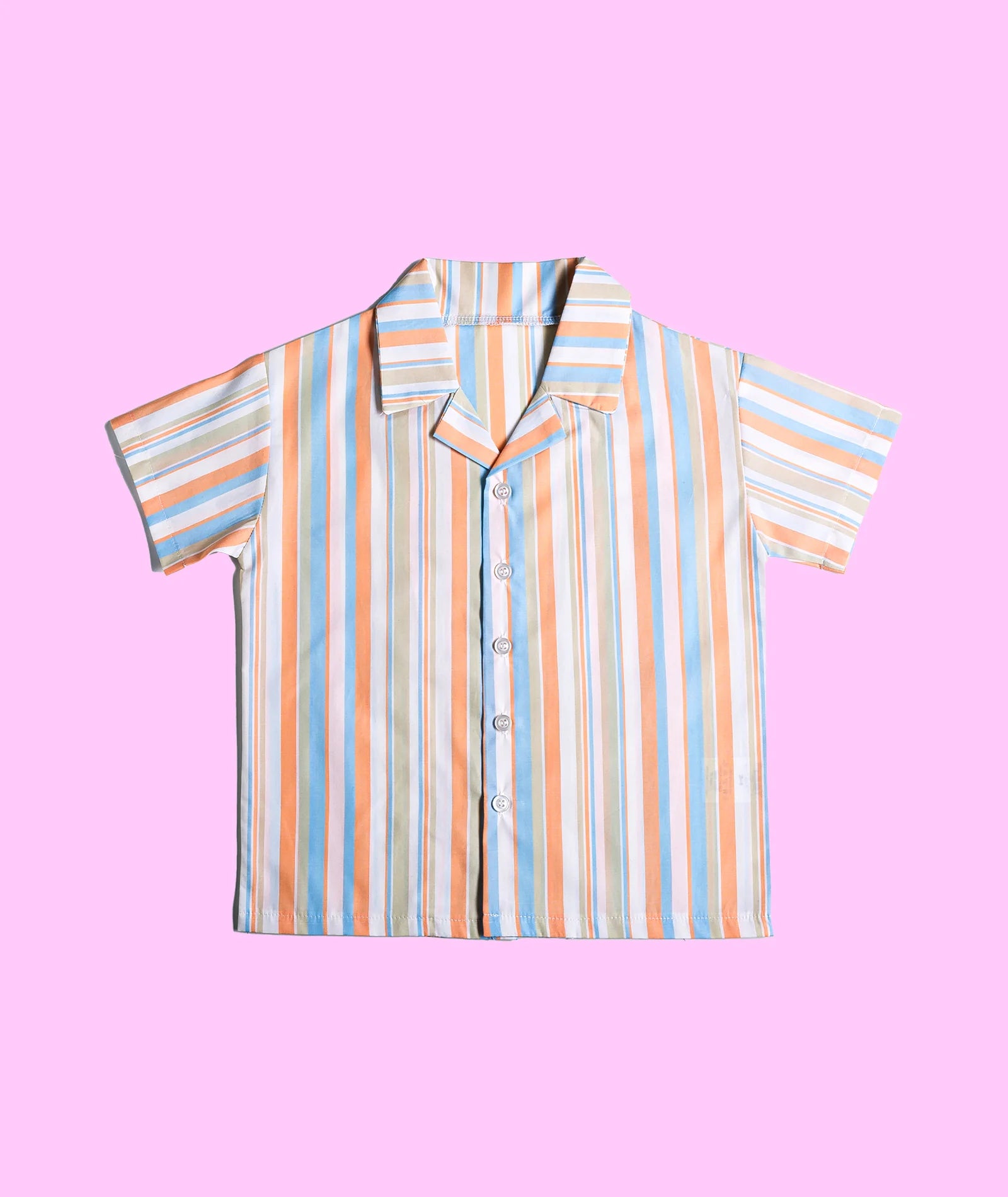 A colorful striped, half-sleeved, button-down, 100% cotton, relaxed collared children's shirt with a striped pattern will keep your little ones comfortable and stylish this summer! With our fun, comfortable, and 100% cotton fabric collection, your children will have tons of fun and move freely!